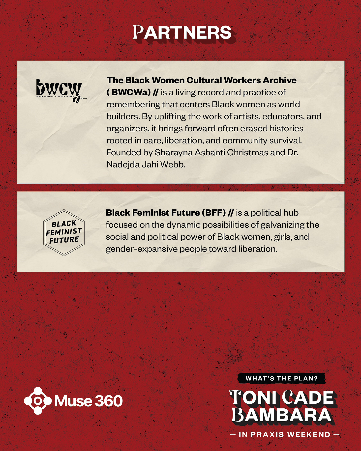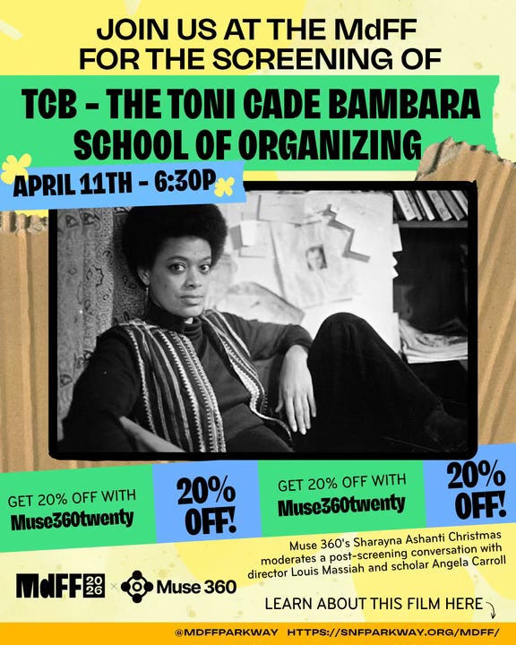The Maryland premiere of TCB — The Toni Cade Bambara will be held on April 11 at 6:30 pm as part of Maryland Film Festival 2026. The founding Director of Muse 360, Ms. Sharayna Ashanti Christmas, will moderate a post-screening conversation with director Louis Massiah and scholar Angela Carroll. You can find tickets here.