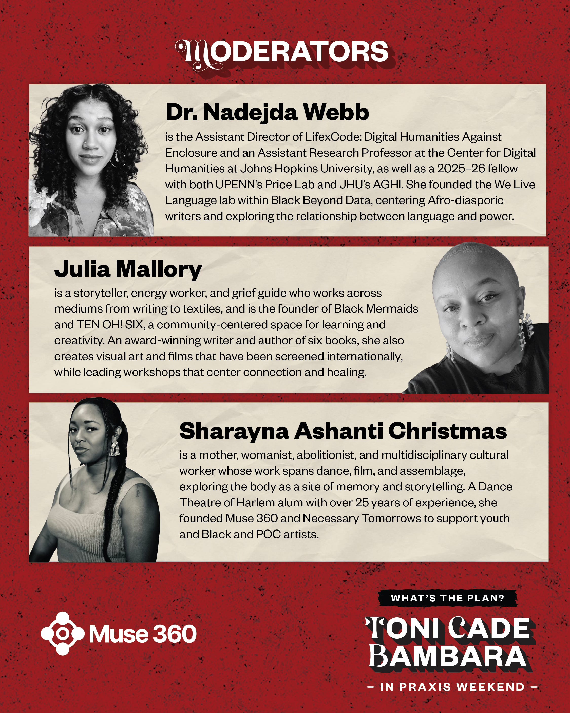Grounded in Toni Cade Bambara’s assertion that “sister is a verb,” and as Alexis Pauline Gumbs reminds us, “sisterhood is built by action, not by biology,” we approach sisterhood as an intentional practice of showing up, holding space in love, and tending to one another. Guided by Black Women Cultural Workers Archive founders Nadejda Webb and Sharayna Ashanti Christmas, with a collective poetry collaboration led by Julia Mallory, this space invites participants into a lived practice of sisterhood rooted in presence, responsibility, and care.